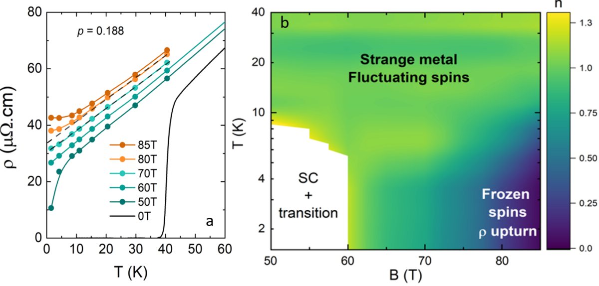 We used fields as high as 86 T to explore the physics of strange metals in the cuprate superconductor La2-xSrxCuO4 (LSCO). Close to the critical hole-doping concentration of the pseudogap p = 0.19, we discovered that a temperature-linear resistivity exists down to the lowest temperature over an extended range of magnetic fields, between 60 and 70 T or so, and disappears above (see figure 1a). Indeed, above 70 T, a spin-glass phase gradually appears, as demonstrated previously using ultrasound measurements, and causes the end of strange metallicity, as outlined schematically in the phase diagram of figure 1b. In the region where low-temperature magnetic fluctuations exist, as proven by previous NMR and ultrasound measurements, a linear-in-temperature resistivity appears over an extended range of magnetic field (green area in figure 1b). Thus, the strange metal can be controlled with a field, via spin dynamics, and the strange metal phase is closely linked to low-energy magnetic fluctuations that persist at the lowest temperatures.